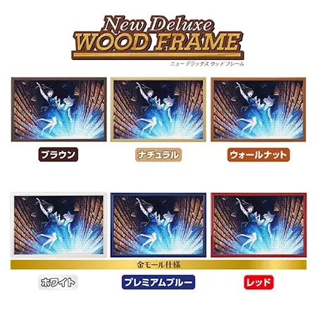 完成後はインテリアとして飾る用途を想定しており、イメージとして木製フレームやアルミ製フレームに入れた際のビジュアル案内が示されています。ただしフレームは別売であり、付属しない点に注意が必要です。
