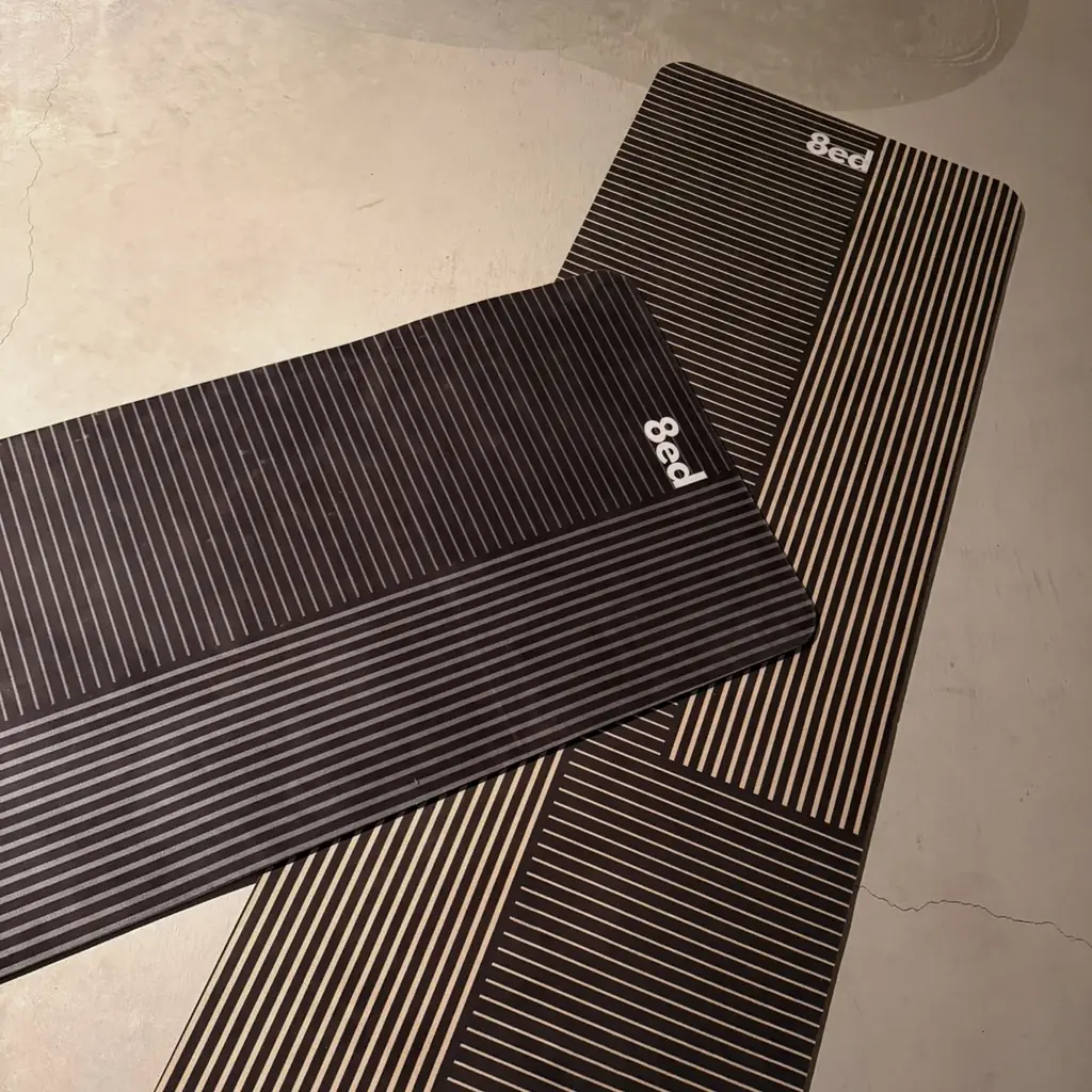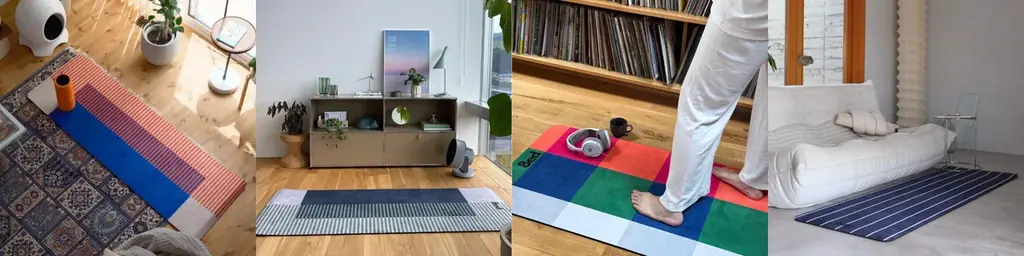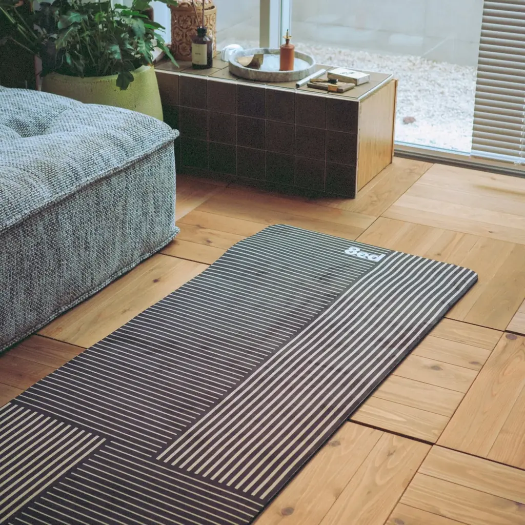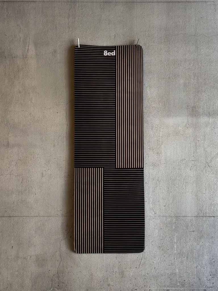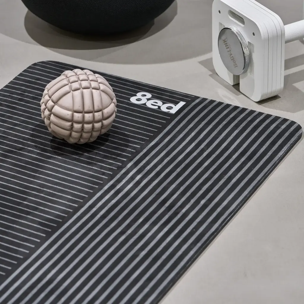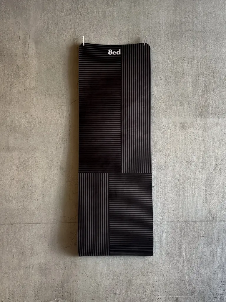 ラインの配列やトーンは、視線を散らさず精神的な落ち着きを生み出すために設計されています。機能的にはストレッチやヨガだけでなく、家庭内でのトレーニングや作業前後のクールダウンなど幅広い用途を想定しています。