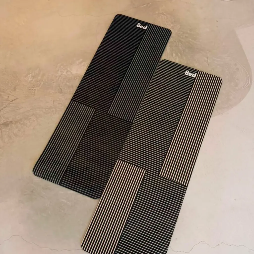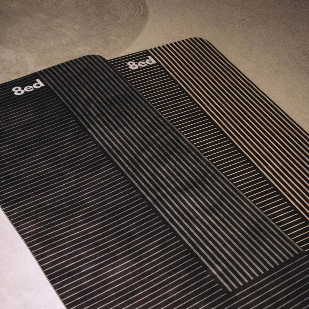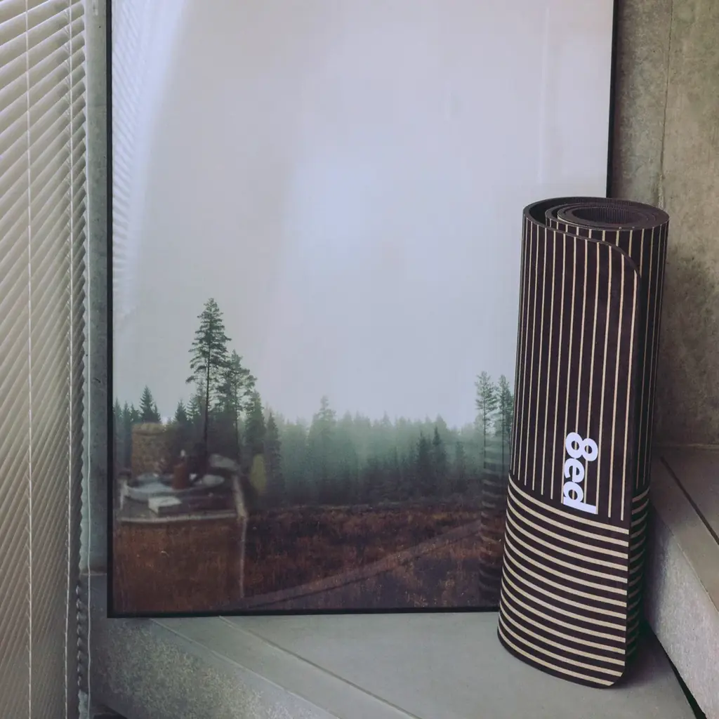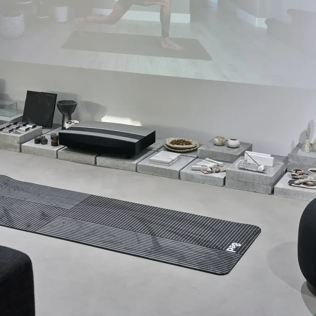 ラインの配列やトーンは、視線を散らさず精神的な落ち着きを生み出すために設計されています。機能的にはストレッチやヨガだけでなく、家庭内でのトレーニングや作業前後のクールダウンなど幅広い用途を想定しています。