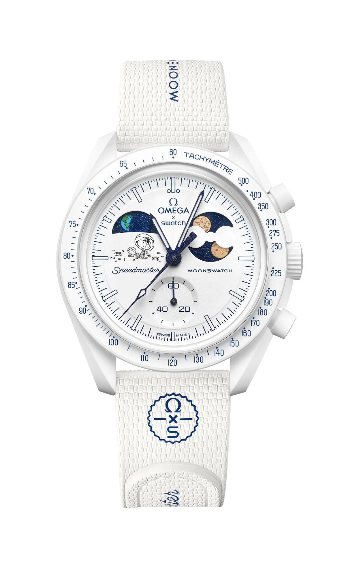 新作は雪の結晶をモチーフにし、ムーンフェイズ表示にレーザー加工で個々に異なる雪の結晶を刻むことにより、時計自体が「二つとして同じものはない」という個性を持つことを打ち出しています。デザインはホワイトの色調で冬景色を想起させる仕上がりとなっており、前作の文字盤レイアウトを継承しつつ、Swatchの技術であるアースフェイズ表示、OMEGAのMoonshine Goldを用いたムーンフェイズ表示で構成されています。