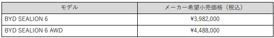 | 販売グレード | BYD SEALION 6(FWD)、BYD SEALION 6 AWD(AWD) |