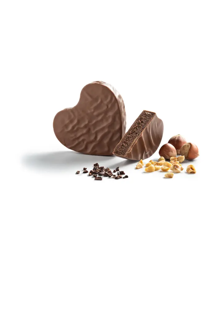 ヘーゼルナッツとカカオのプラリネにカカオニブを加え、ミルクチョコレートでコーティングしたハート型のブシェです。バレンタイン限定のハート型として、ボックスにアソートされる形で展開されます。