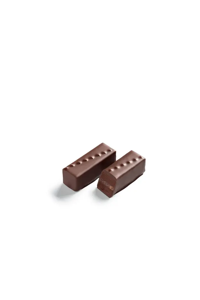 マダガスカル産ブルボンバニラの甘い香りが立つプラリネに、マラバルペッパーのアクセントを効かせたブシェです。アーモンドとヘーゼルナッツのナッティな味わいをダークチョコレートで包んであります。