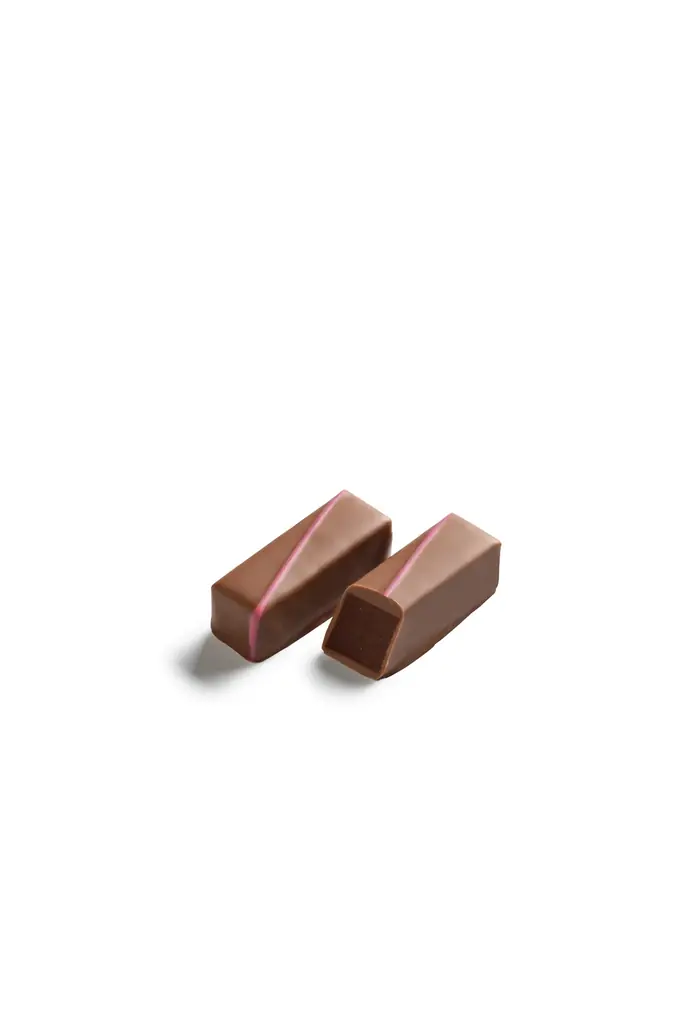 ルバーブのピュレを合わせた繊細なダークガナッシュを、ミルクチョコレートでコーティングした一粒です。最初にミルキーな優しさが広がり、後味にルバーブの爽やかな酸味とフルーティさが顔を出します。
