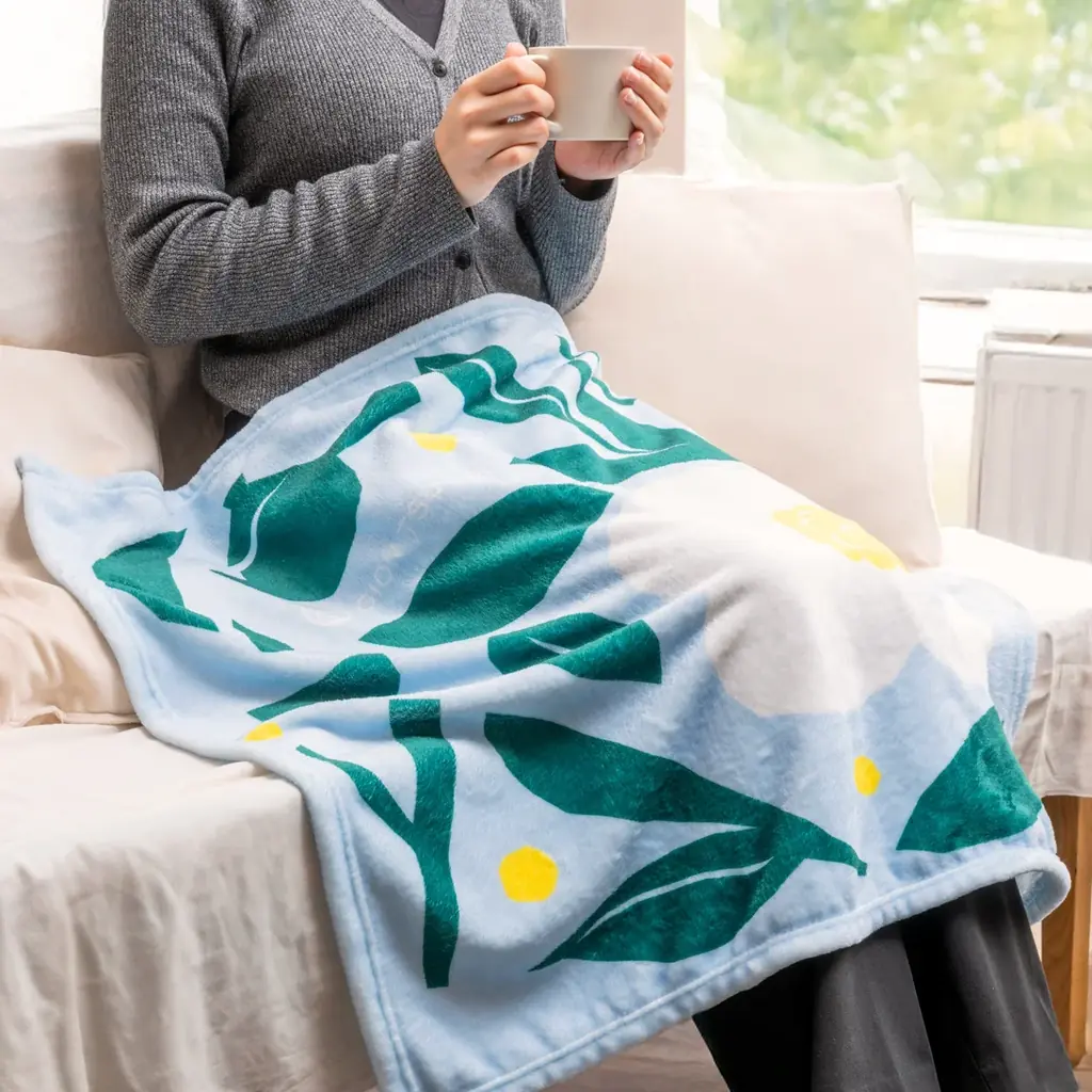 | 祇園辻利オリジナルブランケット(非売品) | 茶花や茶器モチーフ、浅葱色、柔らかな手触り |