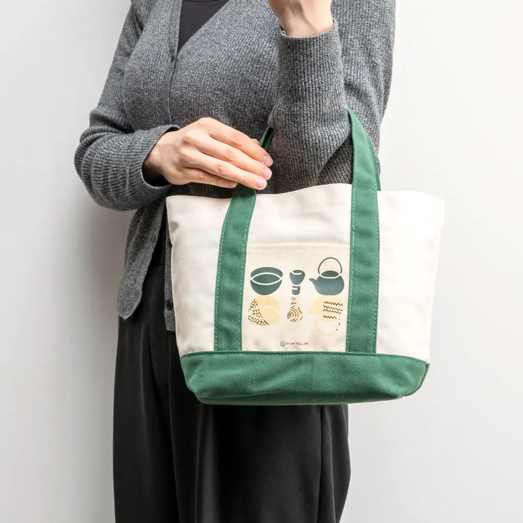 逸品セットの特典は「祇園辻利オリジナルランチトート(非売品)」です。生成りのキャンバス地に深緑のアクセントを配したデザインで、共創アートプロジェクト「京都ふぉんと」とのコラボレーションによる茶器モチーフがあしらわれています。日常使いに適したサイズ感とマチの広さが特徴です。