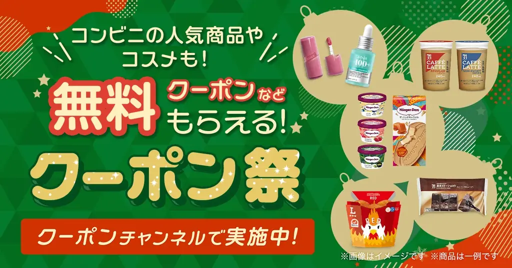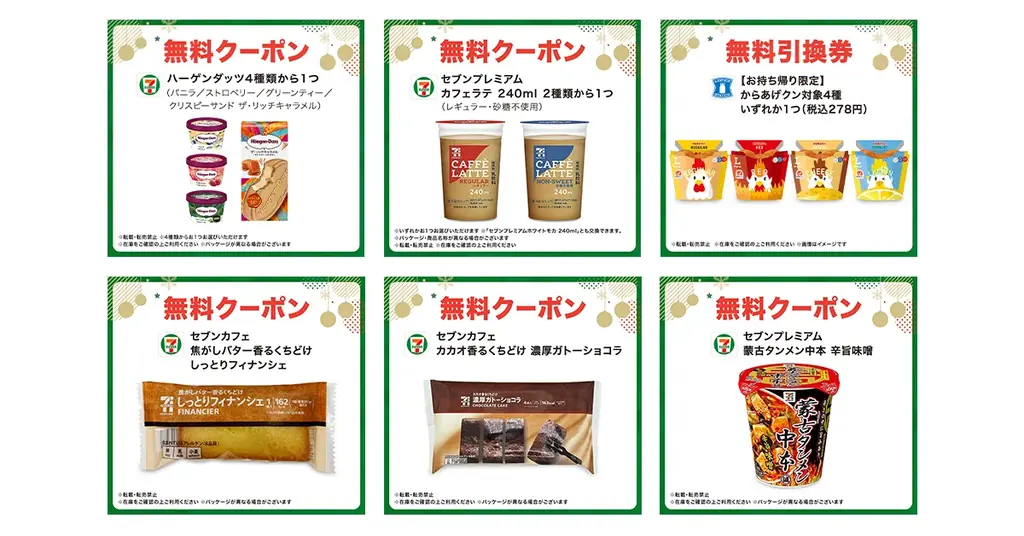 コンビニクーポンの内容 セブン-イレブン:ハーゲンダッツ各種、セブンカフェ商品、フィナンシェ、カフェラテ、蒙古タンメン中本などの無料引換券。ローソン:からあげクン(お持ち帰り限定)無料引換券。