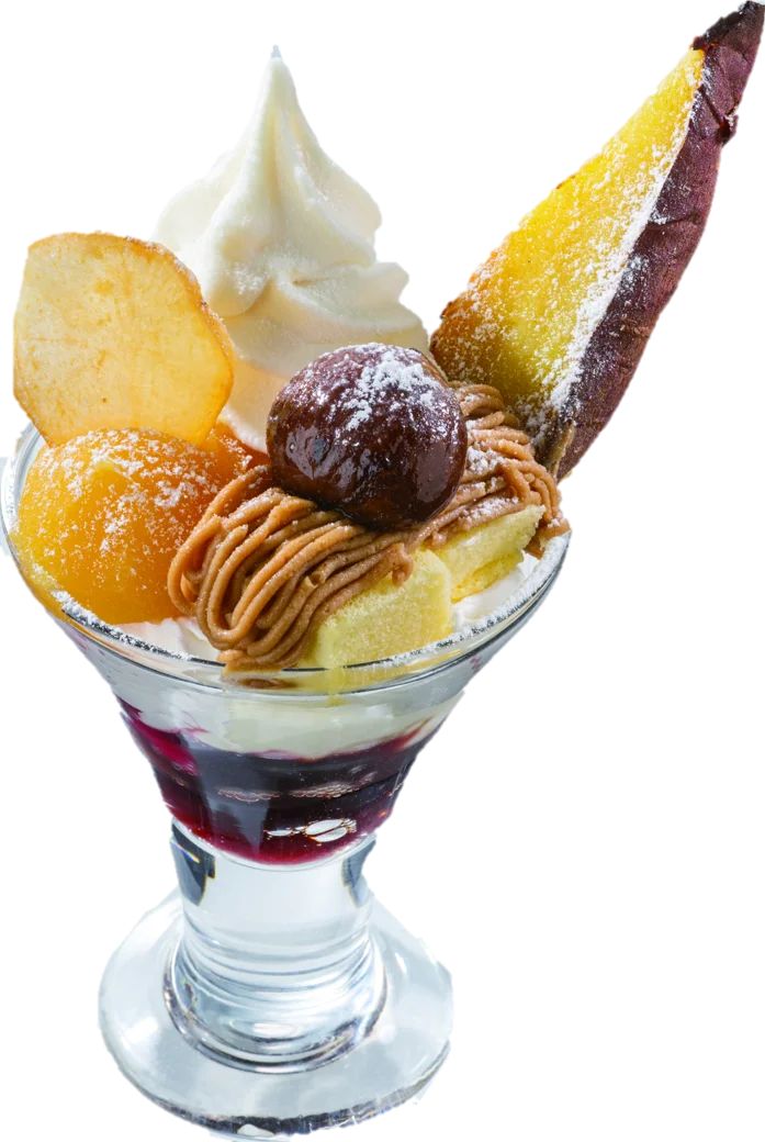 • 蜜いもとマロンのサンデー:627円(税込690円)。構成:ソフトクリーム・紅天使のひんやり焼き芋・紅天使あん・さつまいもチップス・渋皮マロン・イタリア栗のマロンクリーム・バニラ&キャラメルフレーバー・台湾カステラ・ホイップクリーム・マスカルポーネクリーム・ミックスベリー・コーヒーゼリー。