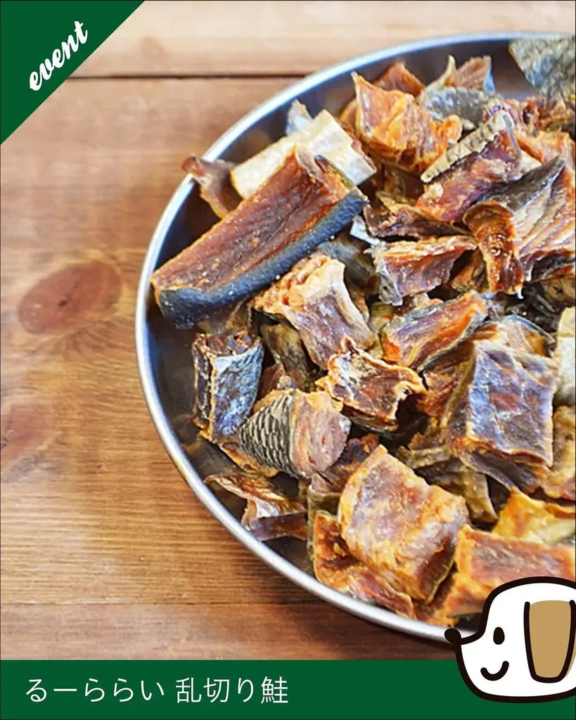 両日10:00〜16:00に、サンタやトナカイなどのクリスマスコスチュームで来店したワンちゃんに、柏の葉T-SITEから感謝の品としてるーららいの「乱切り鮭」を1頭につき1点プレゼントします。受け取り手順は次の通りです。