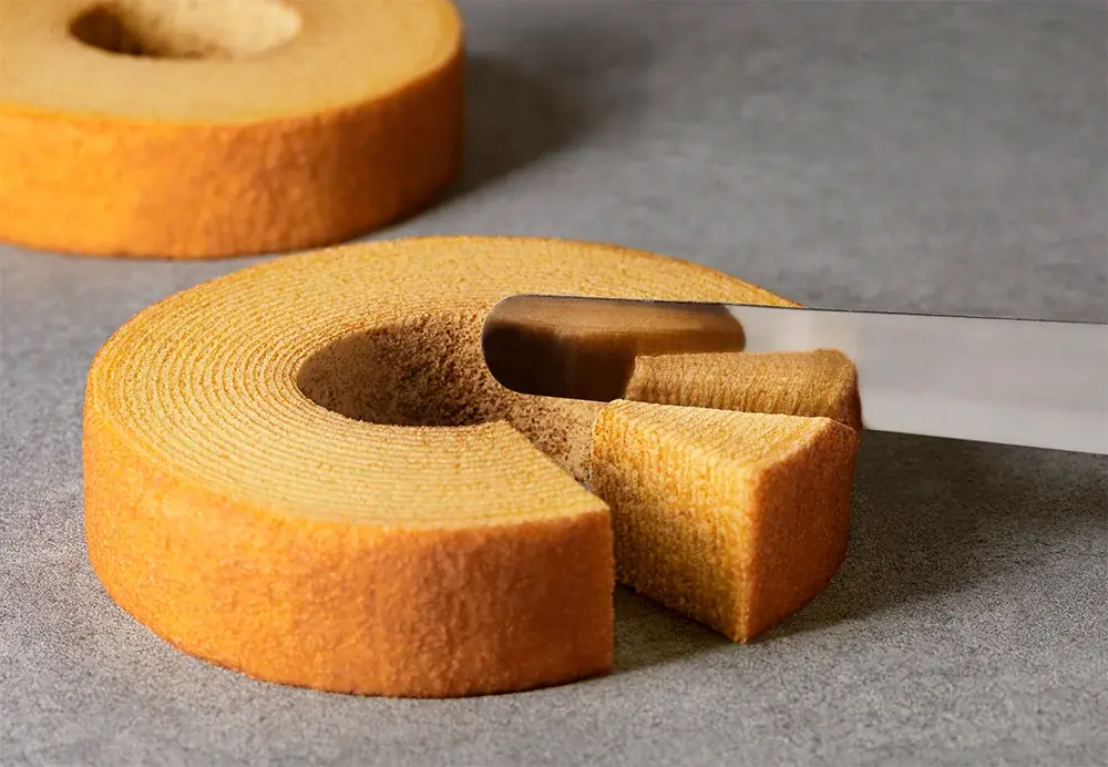 たっぷりの卵を使い、ふっくらジューシーに焼き上げた柔らかめのバームクーヘン。日本の味覚にあわせた食感を目指した商品です。