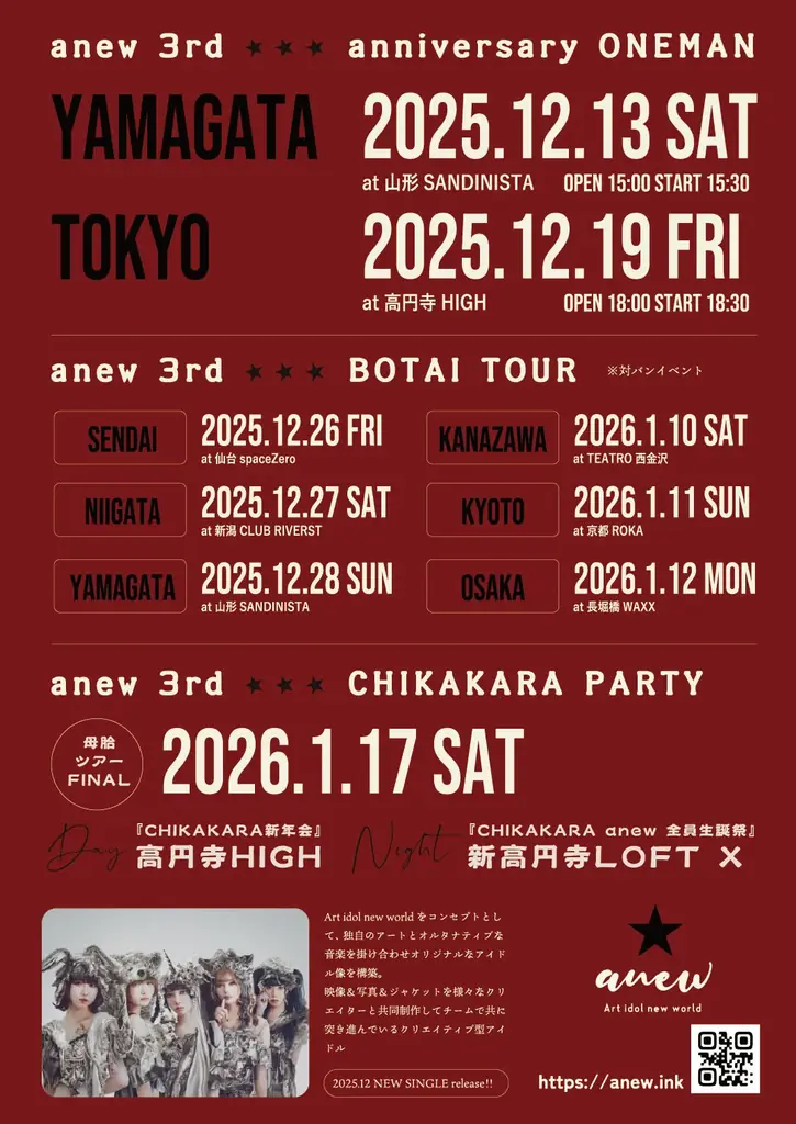 新曲「母胎」の配信を記念し、anewは3周年を迎えるにあたり記念ワンマンと全国ツアーを発表している。まずは3周年記念ワンマン「anew 3rd anniversary oneman ~母胎~」を山形と東京の2公演で開催する。
