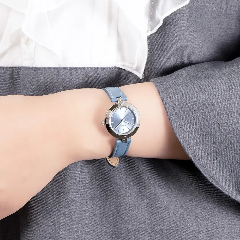 各モデルはバーインデックスのミニマルな文字盤を採用しており、ケースの丸みやストラップの素材感で女性らしさを表現しています。カラーバリエーションにはベーシックな色味と、アクセントとなるミントブルーが含まれます。