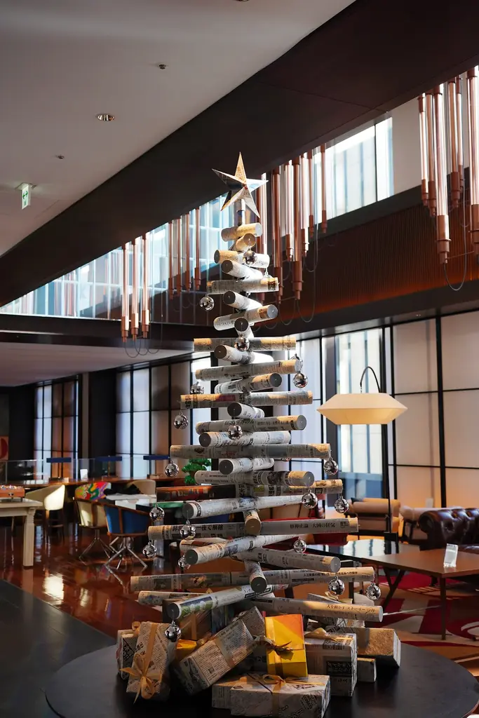 銀座ハイアットで鑑賞する新聞を素材にしたアートツリー