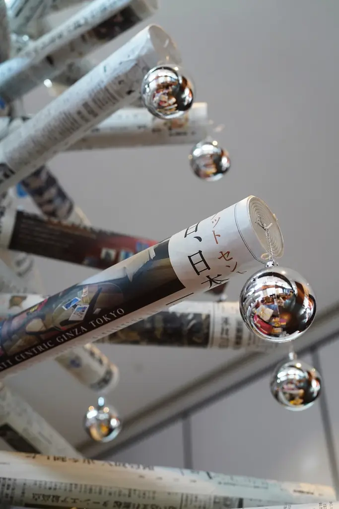 素材と造形の工夫は、作品の主題を鑑賞者に伝えるために綿密に設計されています。ツリーを飾る銀の球体オーナメントは紙面の出来事や人々の記憶、時間の流れを反射する”鏡”の役割を果たします。また、ツリー下に並ぶギフトボックスには印刷工程で生じる「損紙」と実際の新聞紙の双方が混在し、役目を終えた紙がアップサイクルされて“贈り物”として再提示される点が重要です。