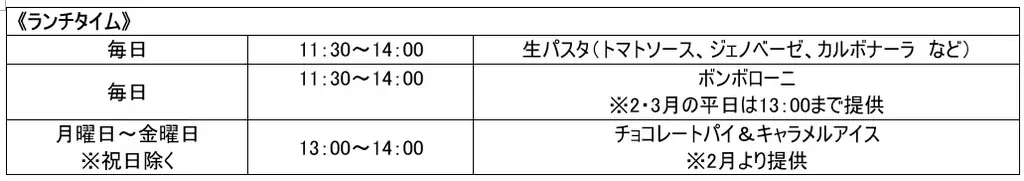 | ランチ限定メニュー | 生パスタ、ボンボローニ、チョコレートパイ&キャラメルアイス(2月はミルクチョコレートパイ、3月はホワイトチョコレートパイ) |