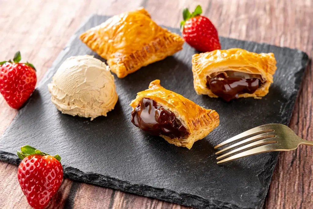 さらに2月からは平日ランチ限定として、ボンボローニや「チョコレートパイ&キャラメルアイス」が登場します。2月はミルクチョコレートパイ&キャラメルアイス、3月はホワイトチョコレートパイ&キャラメルアイスの提供が明記されています。