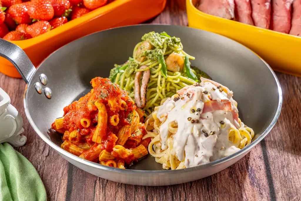 ビュッフェの目玉のひとつが、シェフが目の前で仕上げる生パスタのライブパフォーマンス(ランチビュッフェ限定)です。ソースはトマトソース、ジェノベーゼ、カルボナーラなど定番を中心に用意され、茹で上がりの弾力と香り立つソースが揃うことで食欲を誘います。