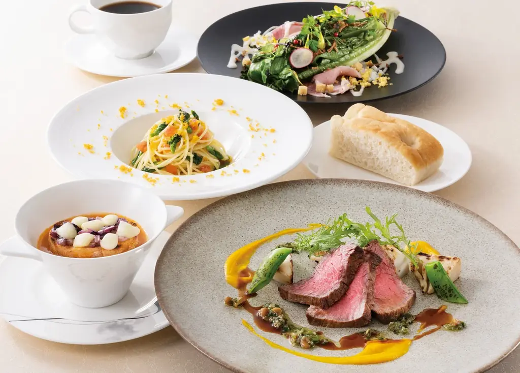 各ホテルでは、それぞれのレストランが趣向を凝らした肉料理中心のランチコースを用意しています。提供時間やフロア、電話番号も含めて各店舗ごとの情報を以下で詳述します。メニューの内容は仕入れ状況等により変更となる場合があります。