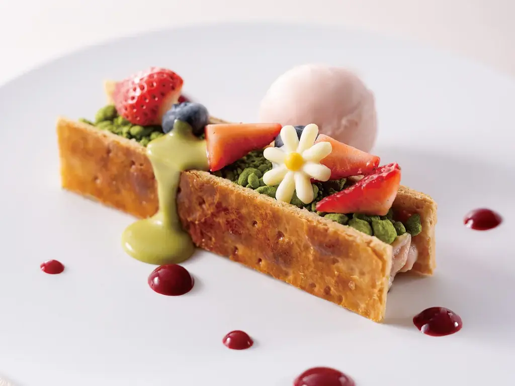オプション苺スイーツ(プラス700円):◇ 苺のミルフィーユ ピスタチオソース。