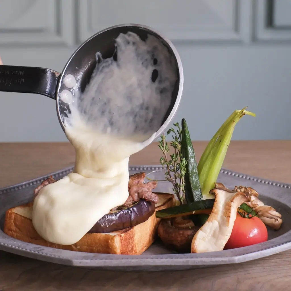 • 5〜6種類の季節野菜ステーキをベースに、お肉やパンのステーキ、特性チーズソースを組合せ可能。特製エシャロットオイルを添える。
