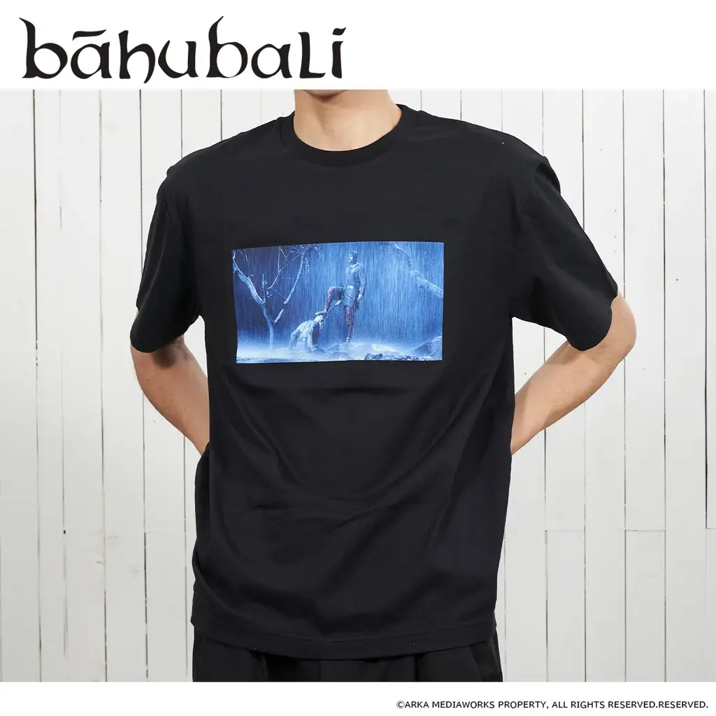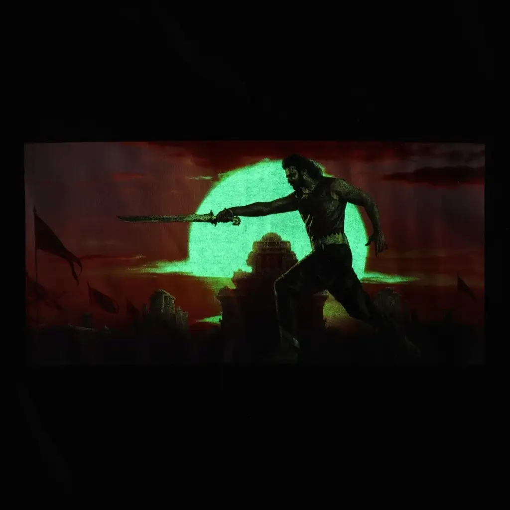 暗闇で光る仕様を持つTシャツです。綿100%の素材で、キャラクターデザインはバーフバリ単体とバーフバリ&カッタッパの2種展開。サイズはS~XLまで用意されています。