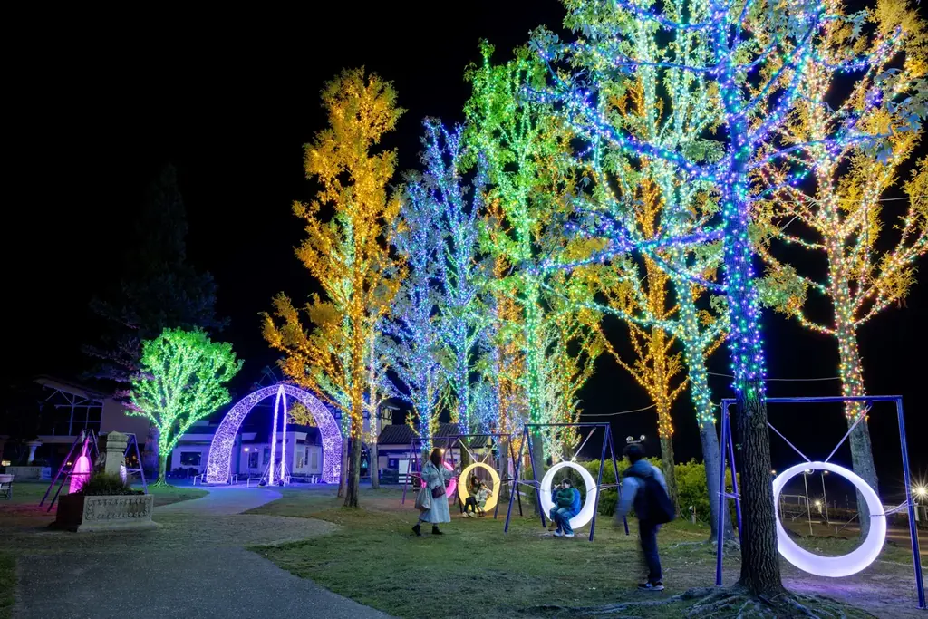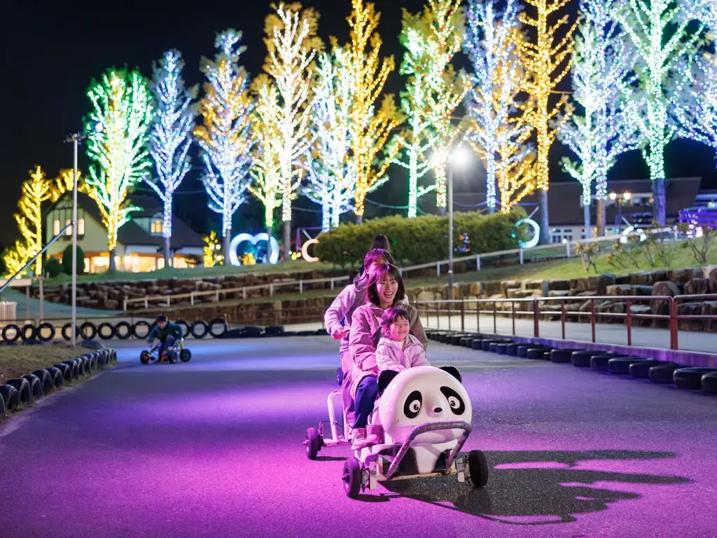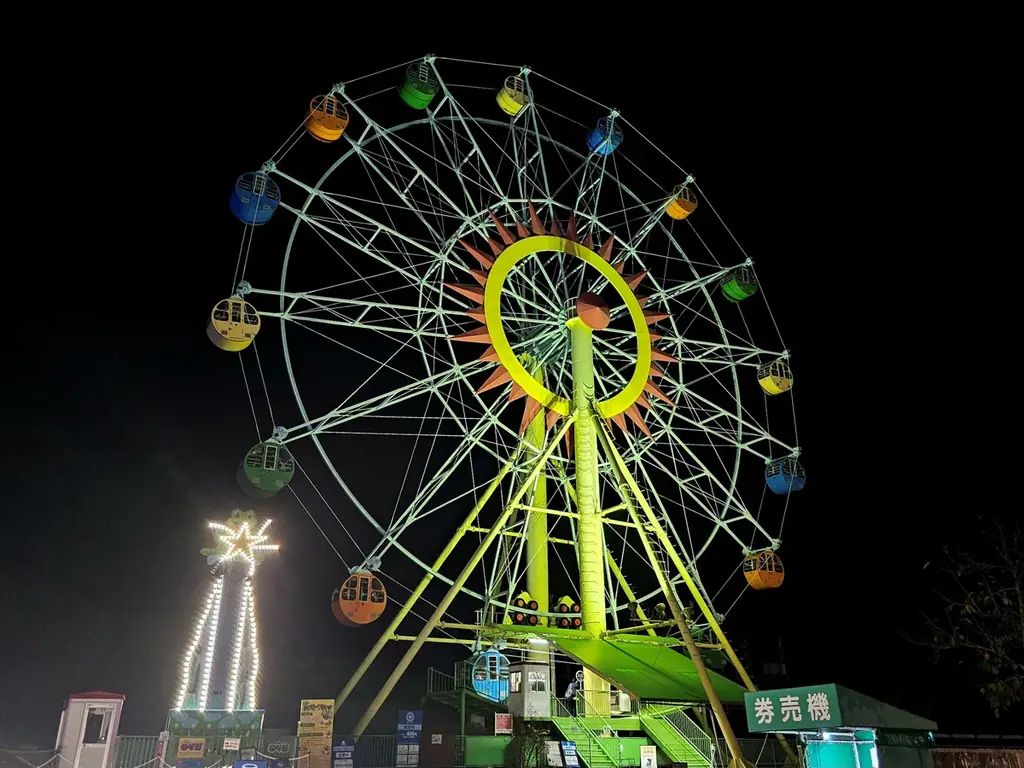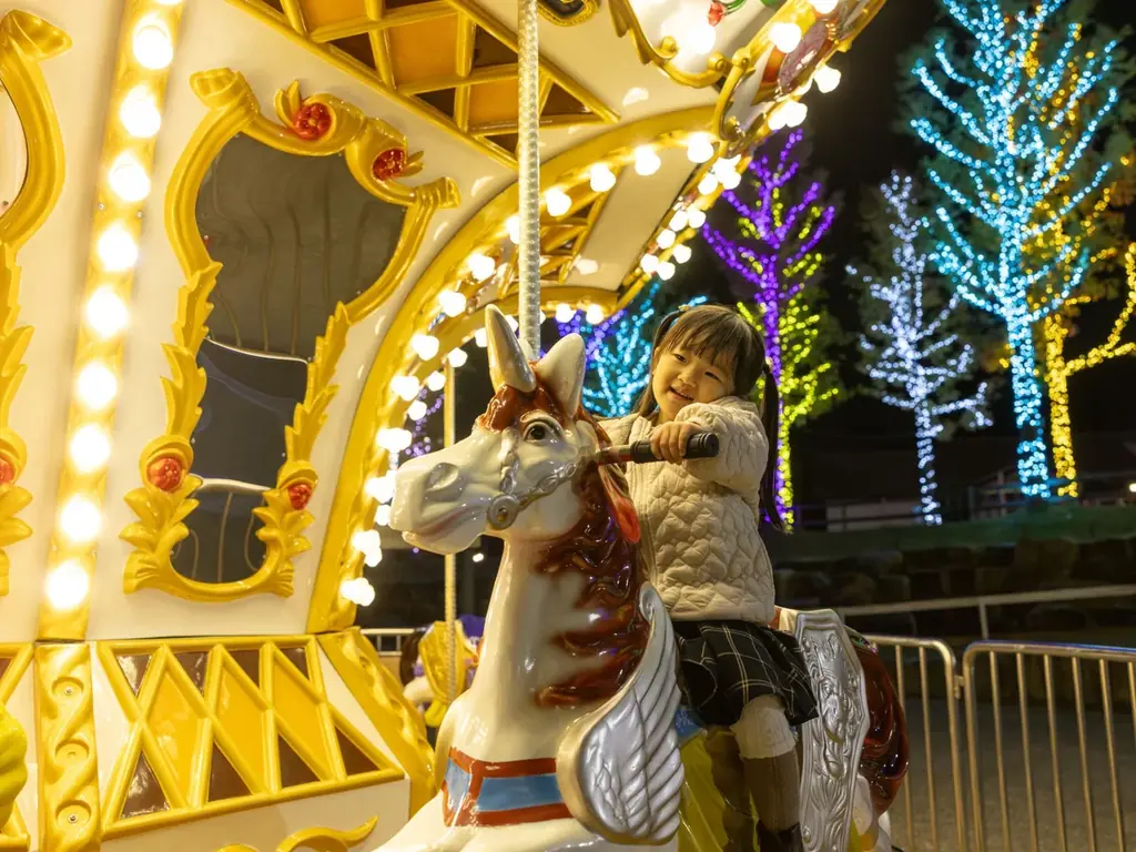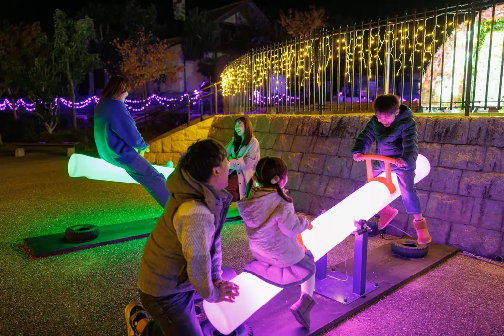 有料の遊具エリアでは今年新たに芝すべりとおもしろ自転車にカラー照明を導入しました。芝すべりは滑走面がレインボーで光り、おもしろ自転車のコース上には多彩な照明が当てられて夜間でも遊べるようになっています。メリーゴーランドや観覧車も夜間営業を行い、遊園地的要素とイルミネーションが同時に楽しめます。