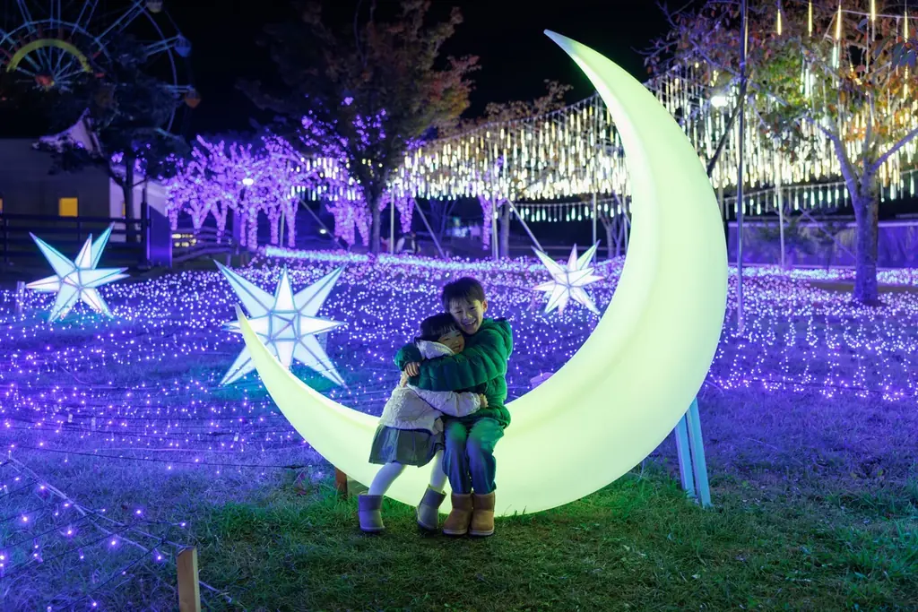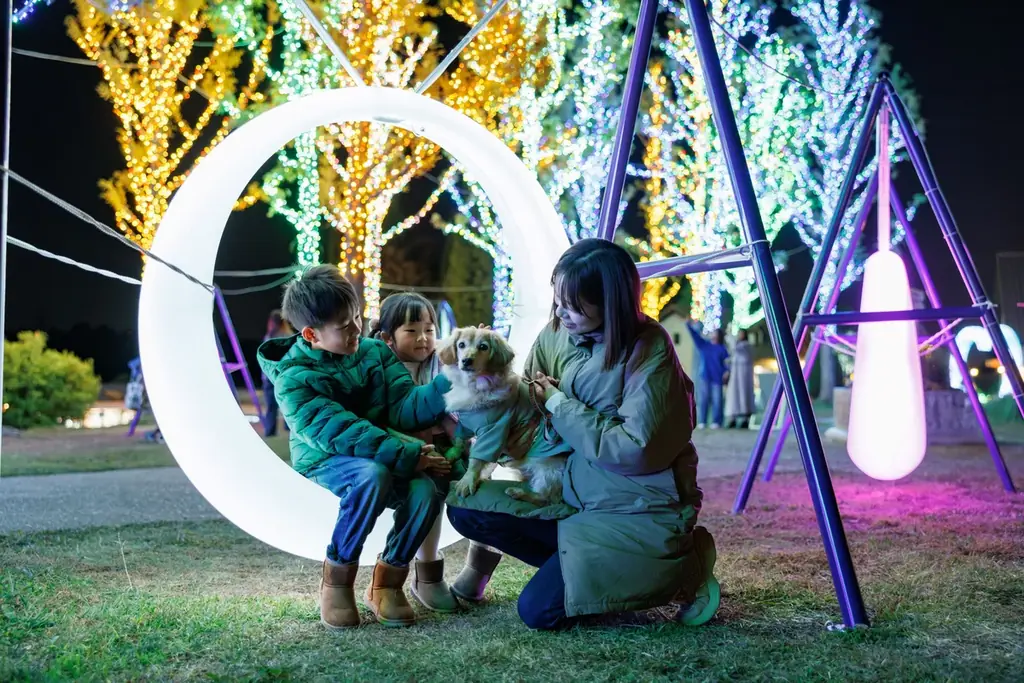 本年の展示はエリアを拡大しており、吊り橋やじゃぶじゃぶ広場といった既存の園内施設にも照明を施しています。設置されている電球数は約100万球にのぼり、南大阪では最大級の規模です。光による景観形成と体験型の演出を組み合わせ、子どもから大人、ペット連れの来場者まで広い層を想定したプログラム構成になっています。