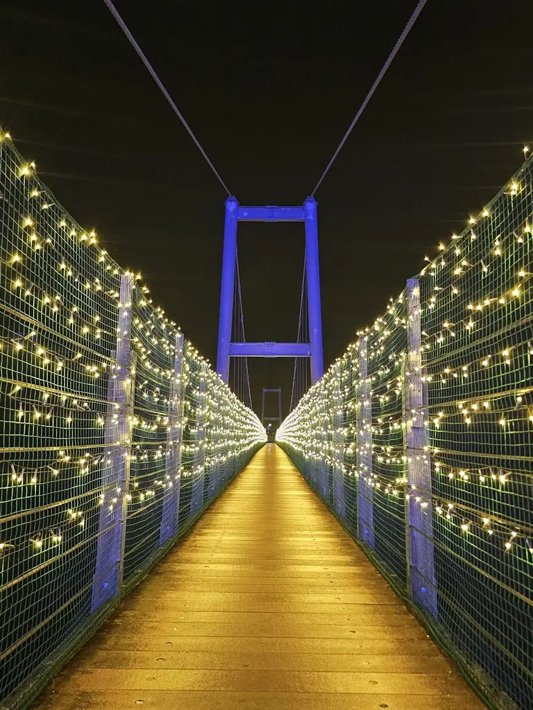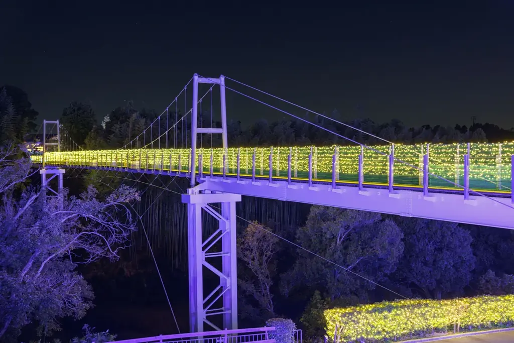 光の架け橋は街のエリアと村のエリアを結ぶ全長130mの吊り橋を金色にライトアップしたスポットで、渡る際に周囲の光に包まれる感覚が得られます。外観からも目を引くラインとして設置されており、遠景からの見栄えも意識されています。