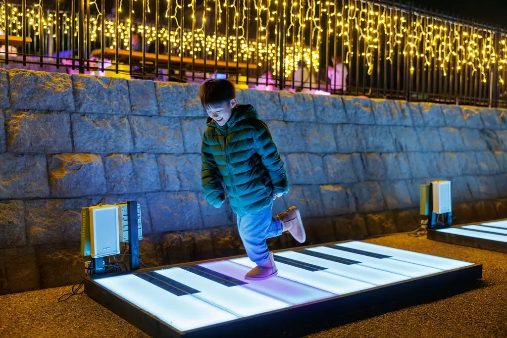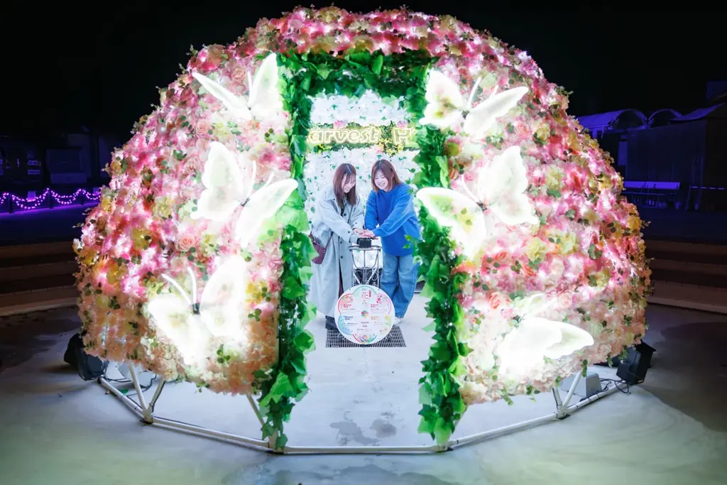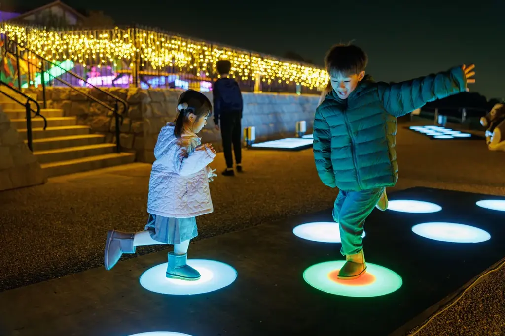 子ども向けの光る遊具は、踏むと音が鳴る光るピアノや様々な音がでる光るプレート、光るシーソーなどを集めたエリアです。フラワードーム内のボタンで開始する光の演出は、最後に園内の花にちなんだ色に変化し、花言葉に基づく“花占い”の趣向が取り入れられています。