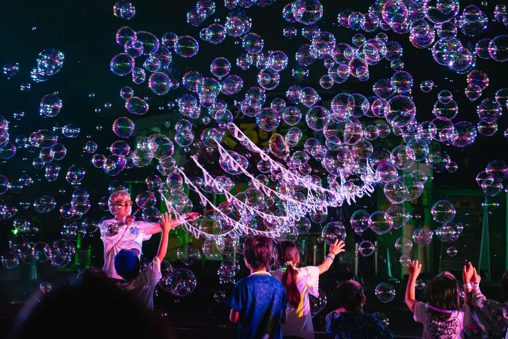 ライトに照らされたシャボン玉が七色に輝くショーは、入園料金のみで観覧可能なナイトショーです。複数の演者・チームによる公演があり、それぞれ演出や規模が異なります。
