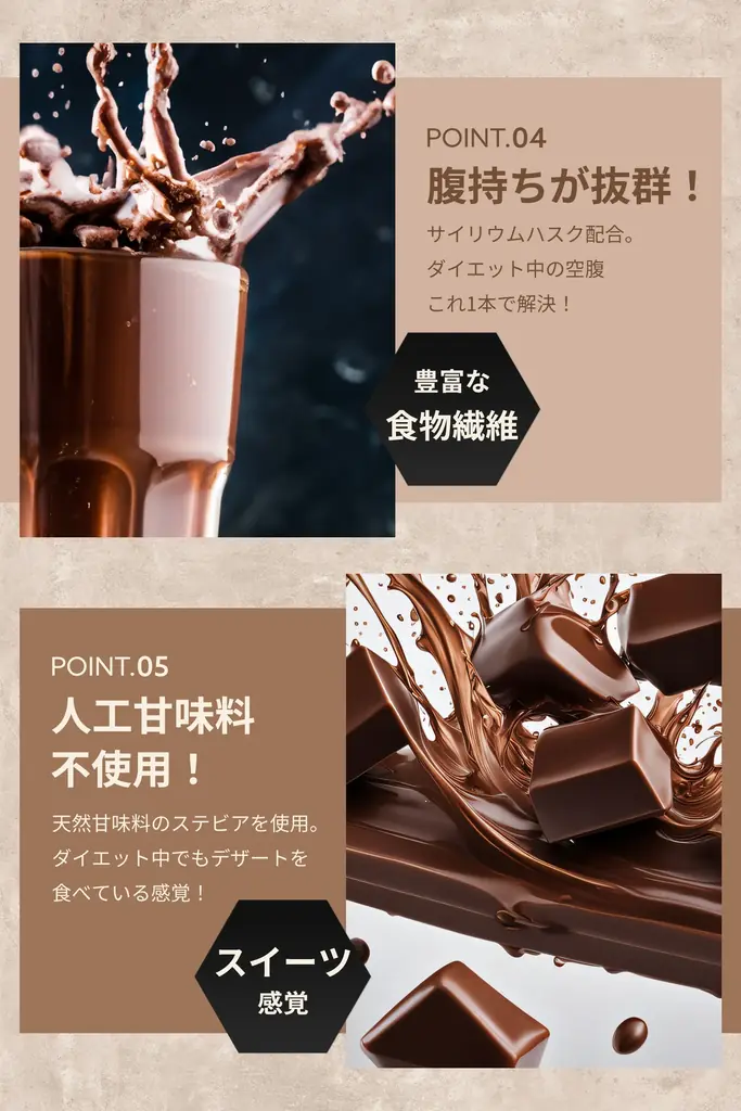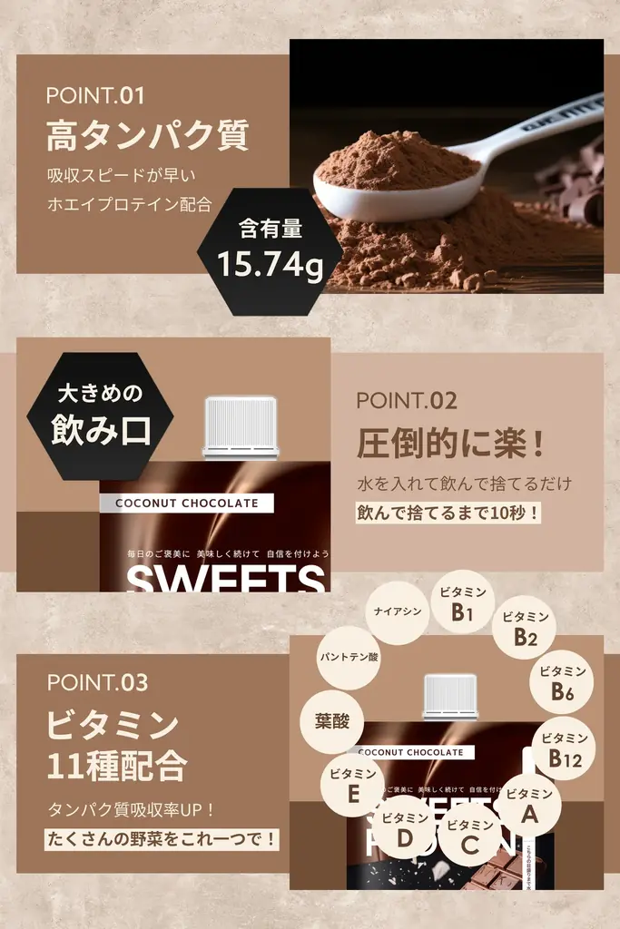 スイーツプロテインは単なるタンパク質補給製品ではなく、「栄養食」としての位置づけがなされています。忙しい朝に食事がとれない会社員や、カロリー制限中の置き換え食として利用できるよう、タンパク質に加えて炭水化物や食物繊維の配合を行っています。