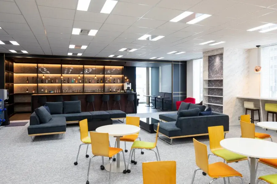 CBTソリューションズのオフィスは「社員ファースト」を基本に設計されており、ラウンジや執務エリアを中心に社員が交流しやすい空間設計が取り入れられています。昼間は打ち合わせやランチを通じた交流を促進し、夜間はバーカウンターでリラックスした交流ができるようになっています。