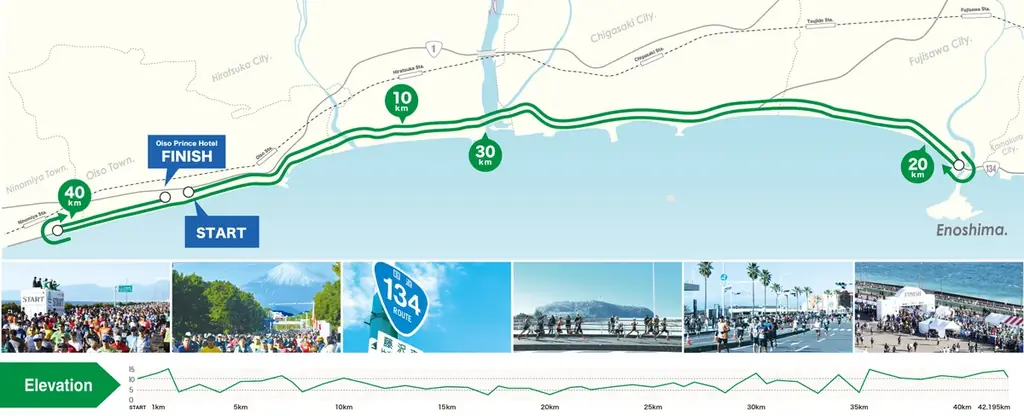 - フルマラソン: 西湘バイパス大磯西IC~(西湘バイパス)~唐ケ原~平塚海岸~柳島~茅ヶ崎海岸~江の島入口付近(第1折り返し)~茅ヶ崎海岸~柳島~平塚海岸~唐ケ原~(西湘バイパス)~西湘二宮IC(第2折り返し)~大磯プリンスホテル