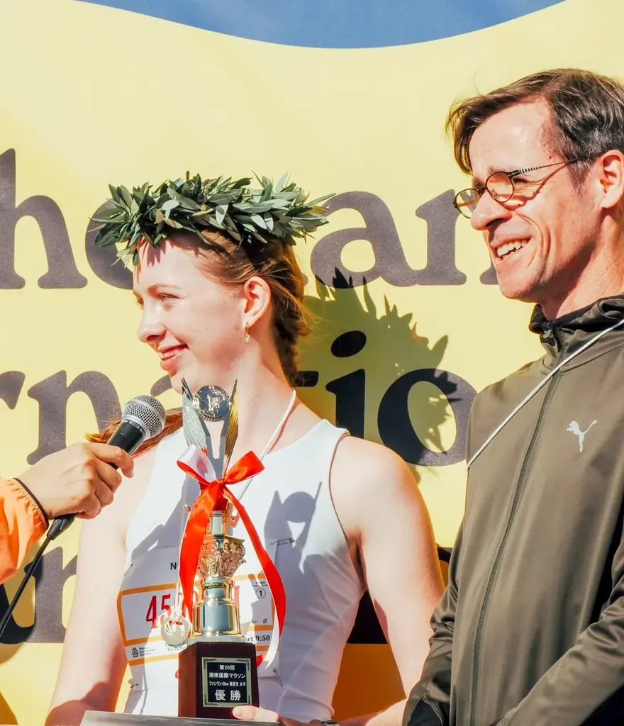 競技面では、男子・女子ともに注目すべき記録やドラマがありました。フルマラソン女子では高野 温菜(たかの・はるな)選手が従来の大会歴代記録2時間44分53秒を3分以上更新する2時間41分16秒で優勝しました。男子フルマラソンでは滑 和也選手が2時間25分09秒で優勝し、2位に1分以上の差をつける力走を見せました。