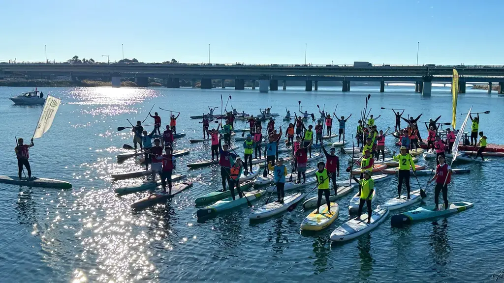 午前9時、マラソンの号砲とともに陸上競技が一斉にスタートすると同時に、Shonan Marine Raceの水上競技も相模川で始まりました。6人乗り・1人乗りのアウトリガーカヌーやSUP(サップ)が川面を進み、湘南大橋からは水上の躍動が見られ、陸上のランナーと水上の選手が互いに手を振り合う場面がありました。
