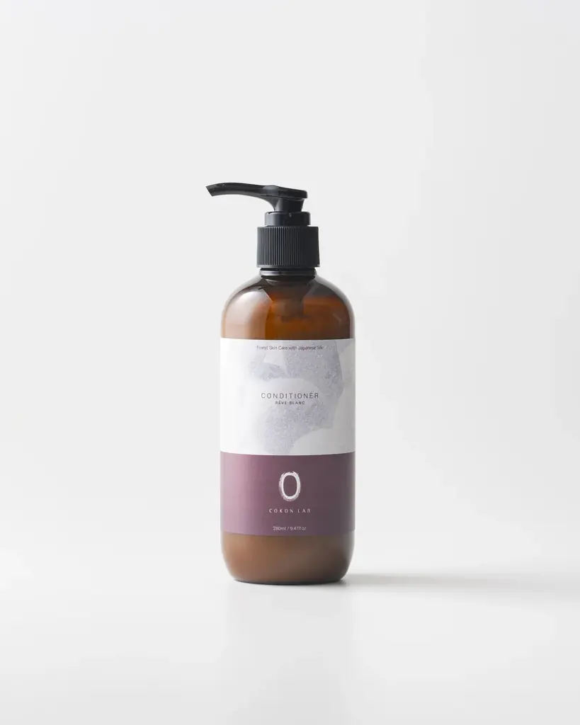ココン・ラボ レーヴブラン コンディショナーは内容量280ml、定価3,300円(税込)で提供されます。加水分解シルクをベースに5種類のオーガニック植物オイルとサクランを配合し、毛先までまとまりのあるツヤ髪を目指す処方です。