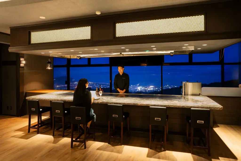 Lueurの店内は、ほのかな間接照明で迎える「プレリュードサロン」、目の前の景色と解放感を楽しめるベランダ、料理の臨場感を高めるライブキッチンを備えています。ディナーは席に着く前にベランダ付きの前室でウェルカムドリンクが提供されるところから始まり、メインダイニングへ移動してライブキッチンで仕上がる料理を香りや音とともに堪能する構成です。
