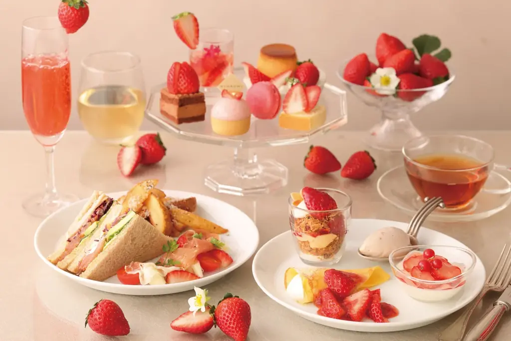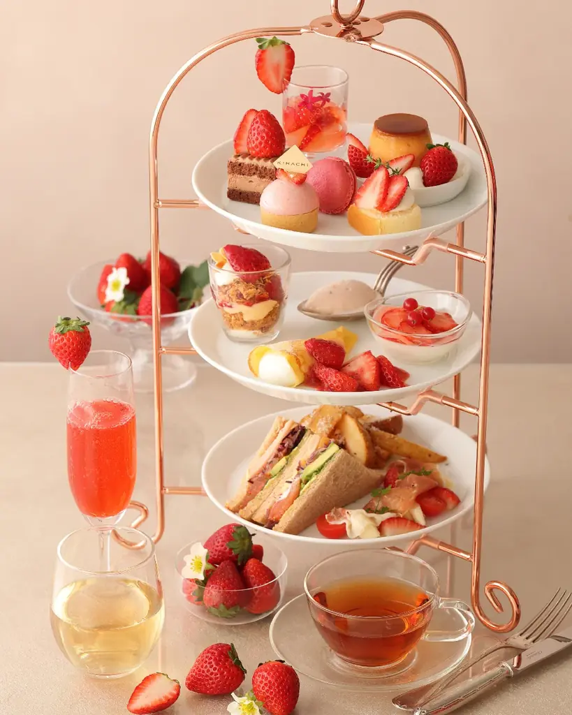 アフタヌーンティーは「いちごさん」をふんだんに使った多彩なスイーツに加え、キハチ自慢のセイボリーが組み合わされています。スイーツは見た目の美しさと素材の個性を生かすラインナップになっています。