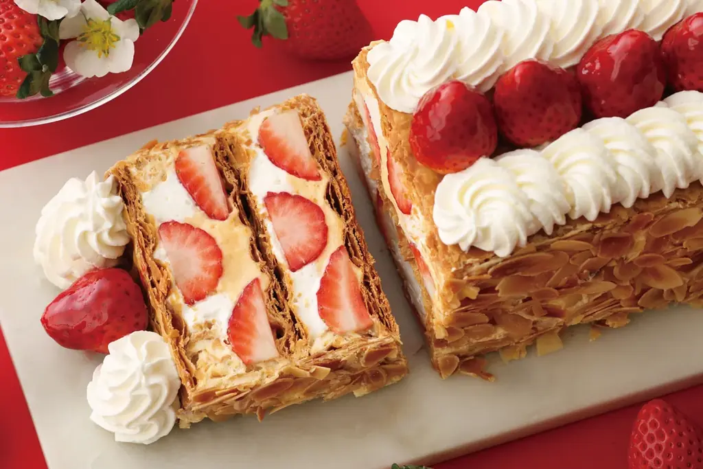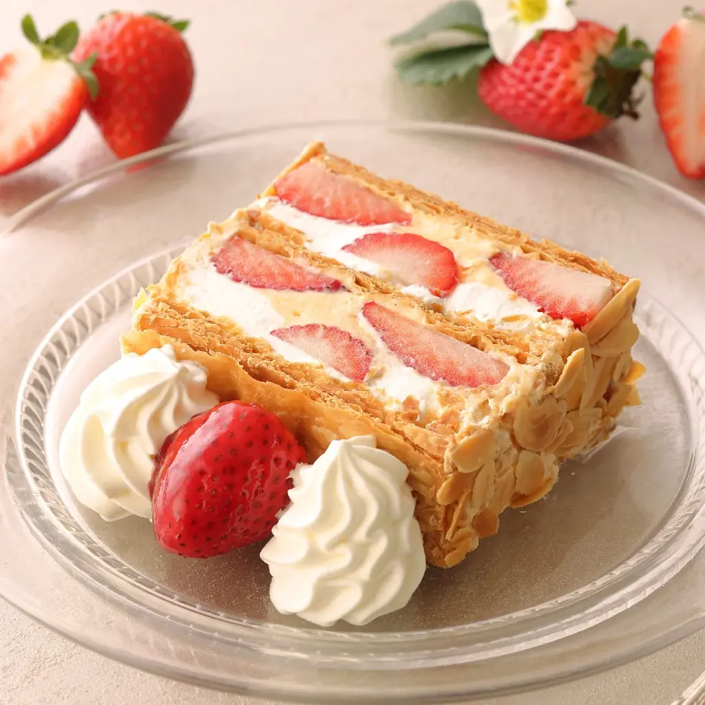 商品構成は、サクサクのパイ生地に苺、クレーム・シャンティ(ホイップクリーム)、ディプロマットクリームを重ね合わせ、酸味と甘みのバランス、食感のコントラストを楽しめる点が特徴です。ナポレオンパイは数量限定での販売になります。