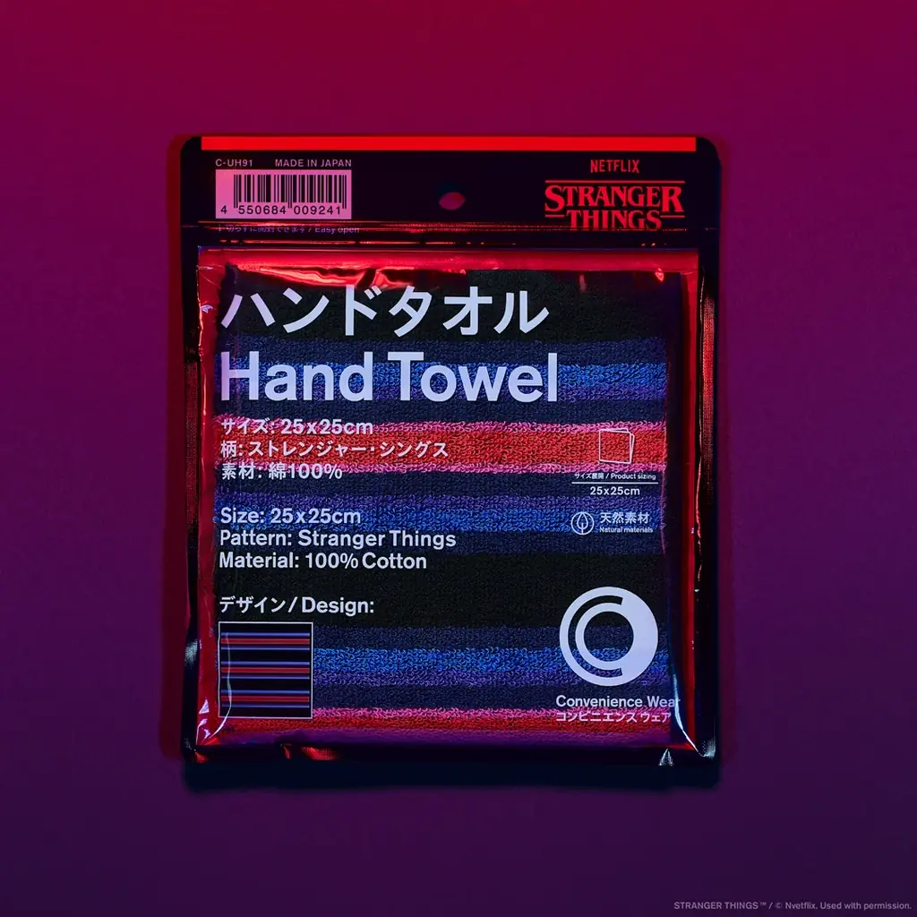- 内容:今治製の高吸水ハンドタオル。『ストレンジャー・シングス』をモチーフに配色し、オリジナルタグを付与。