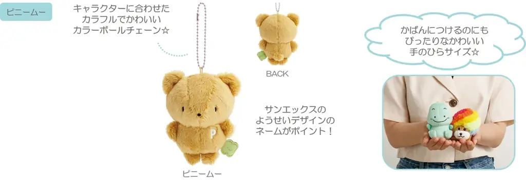 サンエックスユニバースの立ち上げに伴い、第一弾の新商品として「ずっといっしょぬいぐるみ」が発売されます。本商品はチェーン付きのぬいぐるみで、全36種がラインナップされています。各種の販売価格は1,980円(税込)に設定されています。