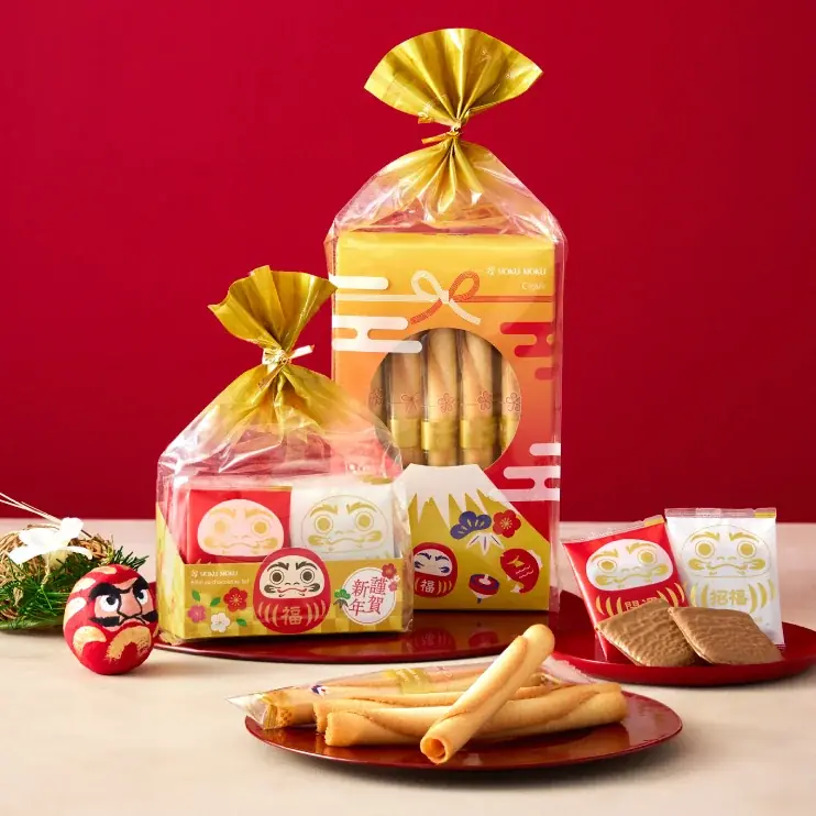 焼き上げた生地を二つ折りにしてミルクチョコレートで包んだクッキーです。パッケージの中心にだるまを配し、松竹梅をあしらった個包装は紅白の2種類が用意され、それぞれに「開運」「招福」の文字が添えられています。