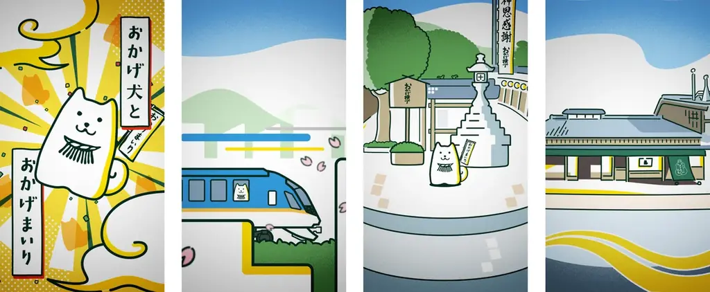 看板の中心モチーフは五十鈴茶屋の焼き菓子「おかげ犬サブレ」に登場するキャラクター“おかげ犬”です。江戸時代の逸話にある「おかげ犬」伝承を下敷きに、近鉄特急「しまかぜ」に乗って名古屋から伊勢へ向かう様子を描いています。