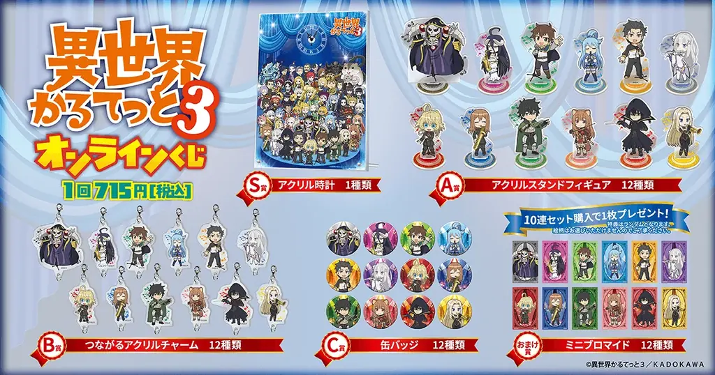本くじの賞品ラインナップは、アニメ「異世界かるてっと3」に登場するキャラクターの魅力を活かしたデザインが中心です。対象となる原作・関連作品には「オーバーロード」「この素晴らしい世界に祝福を!」「Re:ゼロから始める異世界生活」「幼女戦記」「盾の勇者の成り上がり」「陰の実力者になりたくて!」などが含まれます。