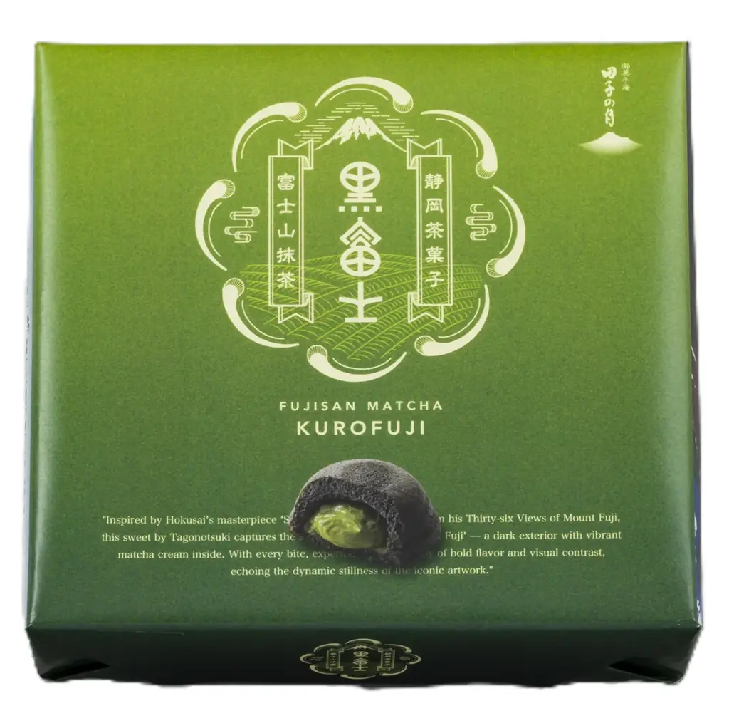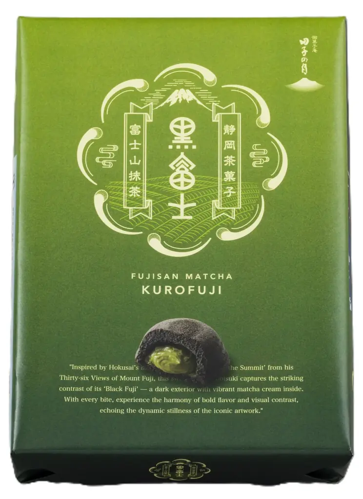 商品名の由来は、浮世絵師・葛飾北斎の作品『富嶽三十六景 山下白雨』の通称「黒富士」にインスパイアされたもので、見た目の漆黒と内部の鮮やかな抹茶色という強いコントラストが特徴です。外皮には富士宮で採れたお茶を炭に加工した『お茶炭』を使用し、内側には富士市で育てられたオーガニック抹茶を用いた濃厚な抹茶クリームをたっぷりと詰めています。