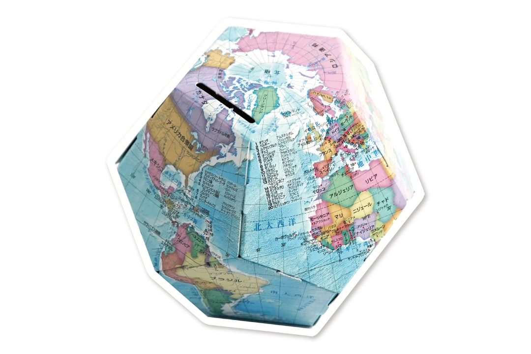 のりやはさみなど道具を使わずに組み立てられる、正十二面体の地球儀です。各面に国名・首都名が記載されており、見るだけで世界の国々に関する知識が得られます。組み立て後は貯金箱などとしても利用できます。