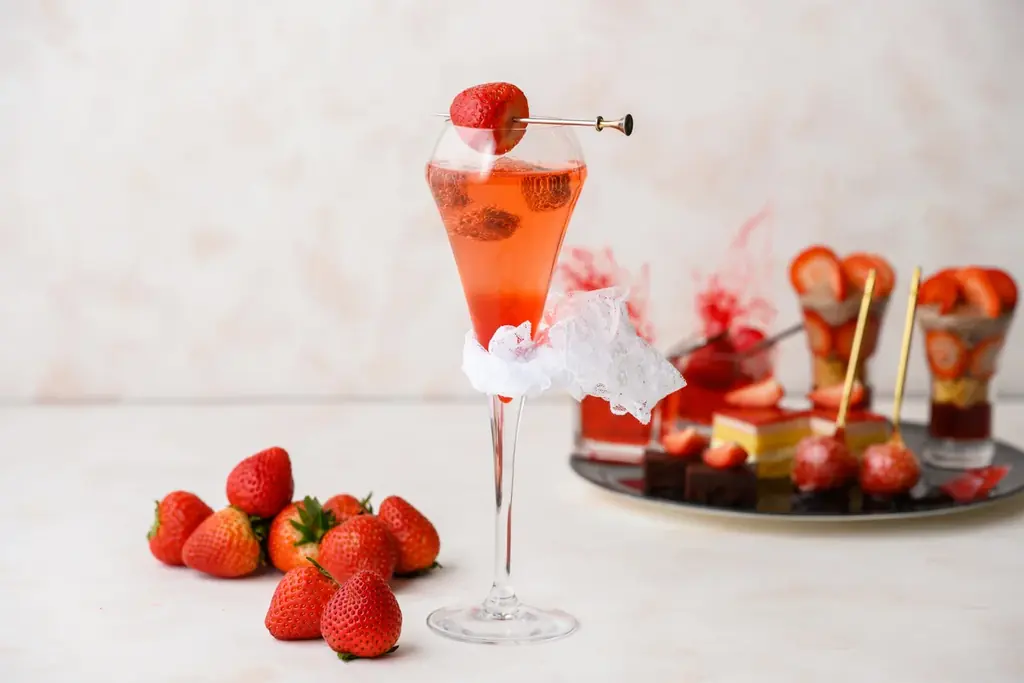 ウェルカムドリンクとしては、ノンアルコールのストロベリーソーダが用意されます。甘酸っぱいソーダの中でチョコレートが上下する演出を加え、見た目と味わいの両面でアフタヌーンティーの世界観を立ち上げます。