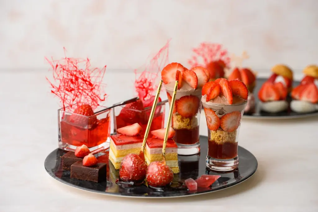 スタンド上段・中段にはグラスパフェやショートケーキなど、パティシエが工夫したスイーツが並びます。苺にホワイトチョコをまとわせたパリパリ食感の品や、ジュレとシャリシャリの組み合わせで苺の風味を引き立てる品など、口当たりの違いを意識した品揃えです。