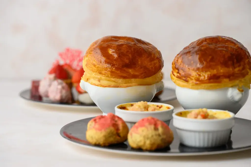スタンド下段にはセイボリーが3種類用意され、お口直しとしても機能します。なかでもビーフシチューのパイ包み焼きは、香ばしいパイと濃厚なシチューの組み合わせで冬に映える味わいに設計されています。