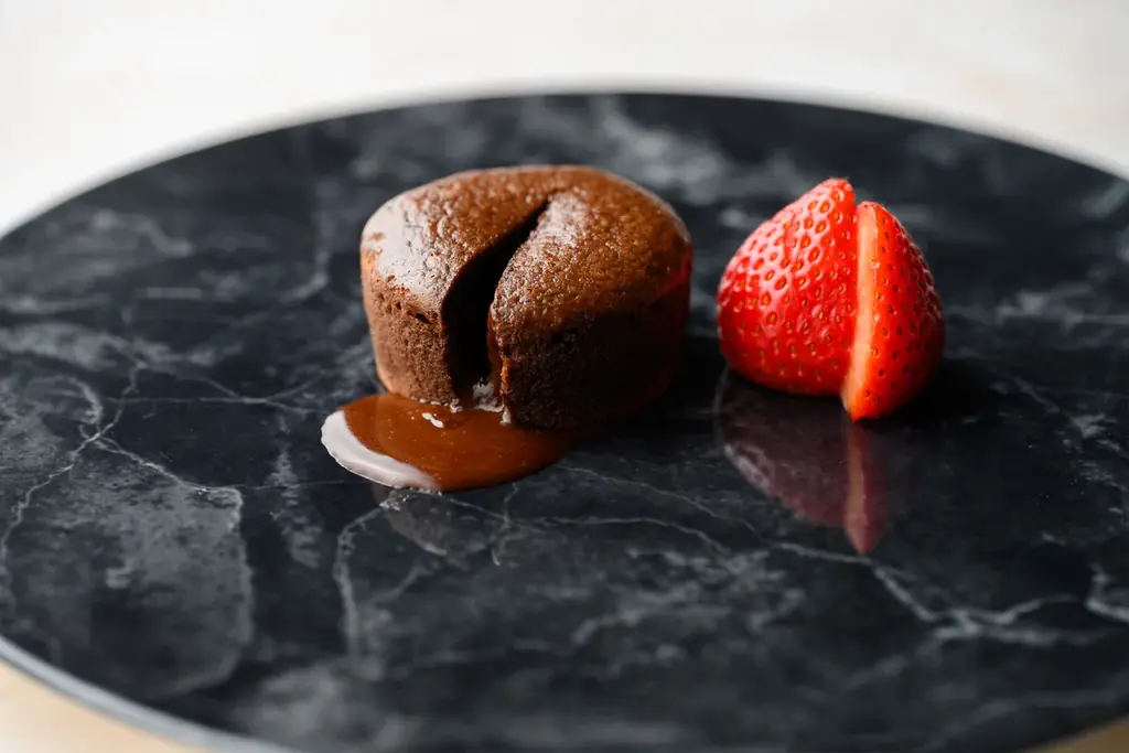 別皿提供のフォンダンショコラ 苺のラム酒漬けは、ナイフを入れるとチョコレートがとろりと溶け出す一品です。ビターテイストのチョコレートとラム酒漬けの苺が交わることで、香りとコクのある味わいを楽しめます。
